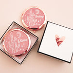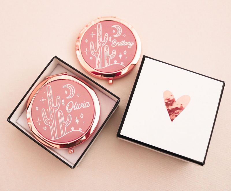 Pretty desert cactus mirror compacts make a stylish gift for your summer bridal party! Each compact mirror comes with the name of your choice on a rose background with a desert cactus design. Choose from gold, silver, or rose gold for compact color.