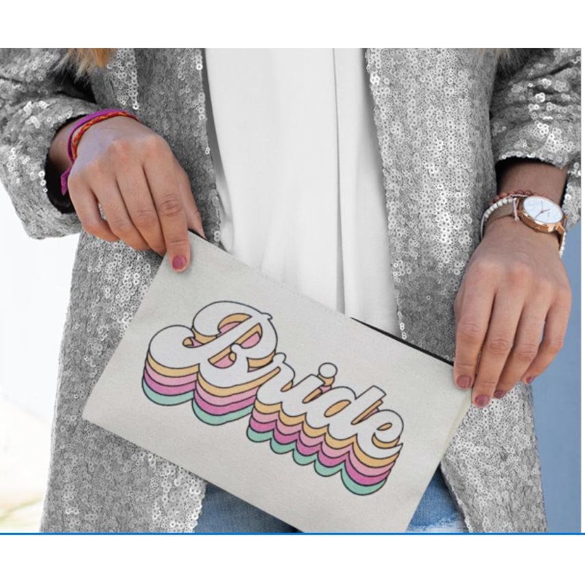 Retro bridal party cosmetic bags are a great gift for bridesmaids, the maid of honor, or any gal in your bridal party! Each cotton canvas bag comes with a rose gold zipper and can be customized with your choice of "Bride" or "Babe".