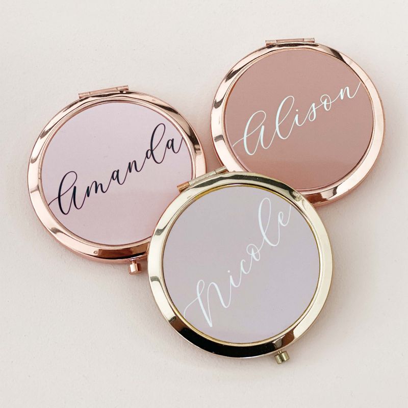 Personalized color compacts make a unique and stylish gift for any event! Each compact mirror comes in your choice of a gold, silver or rose gold mirror and is personalized with a custom script name on a background color of your choice.