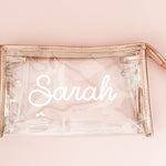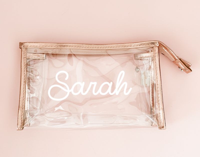 Personalized Metallic Cosmetic Bags are the perfect addition to your bridal party proposal gifts! Makeup bags can be filled with bridal party shirts, compact mirrors, robes, lip balm, sunglasses and more. Each clear vinyl bag is lined with metallic edges and can be personalized with a name in white vinyl lettering.