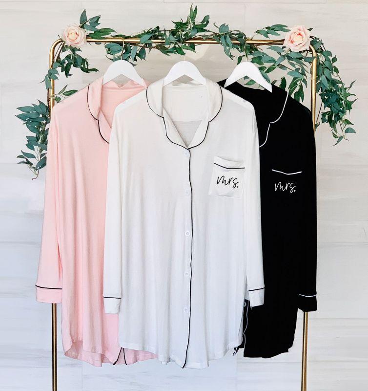 Personalized Wedding Pajamas add an extra special touch to your wedding day! Imagine taking pictures on your wedding day in these bridal party matching pajamas and robes. These make great wedding day getting ready outfits or as a gift to your bridesmaids! Choose from sleep shirts, button down shirts, floral pj sets and more! don't forget to get a sleeping mask to go with your pj set!
