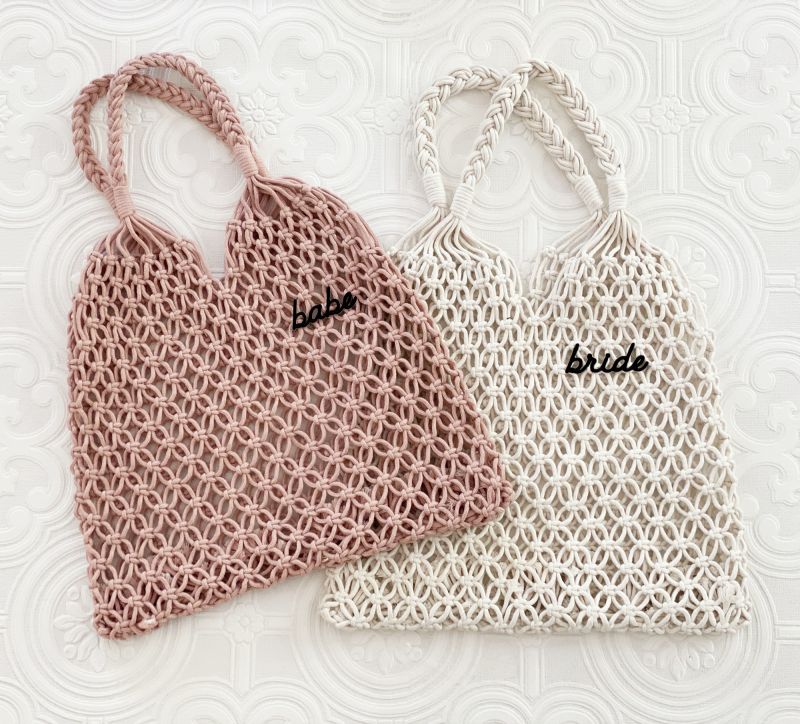 Bride & Babe Boho beach bags are a trendy way to package your bachelorette gifts! Each lightweight macrame bag comes in your choice of pink or white and an embroidered patch of bride or babe.