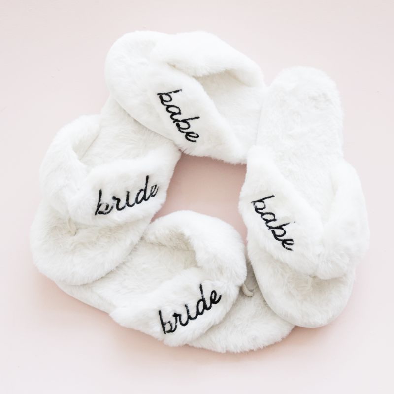 Bridal Party Slippers make a great gift for the bride-to-be and bridal party! Each soft, faux fur pair of slippers comes in your choice of bride or babe.