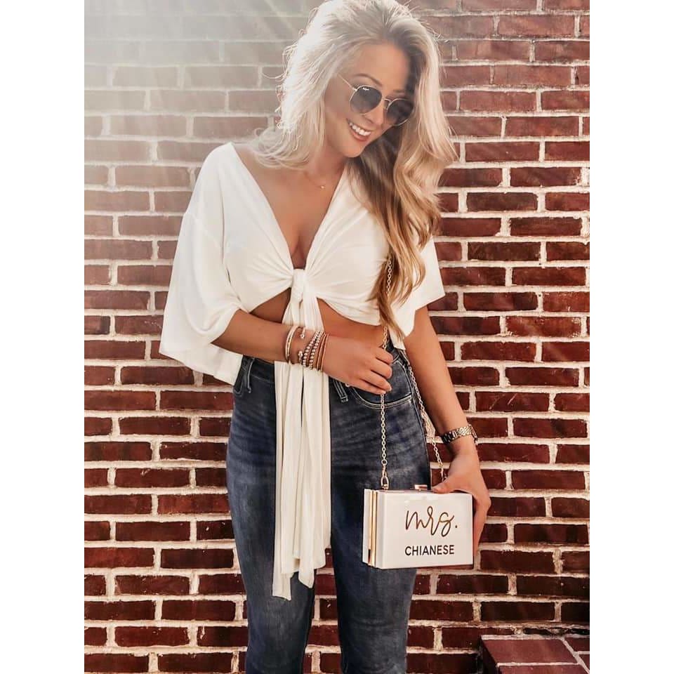 Mrs. acrylic purses make a cute bridal shower gift to the bride! Each cross-body clutch is personalized with "Mrs." in pretty gold script vinyl. Add the bride’s new last name for an additional charge. Purses come with a clasp closure and gold trim in your choice of clear, black, pink, or white.