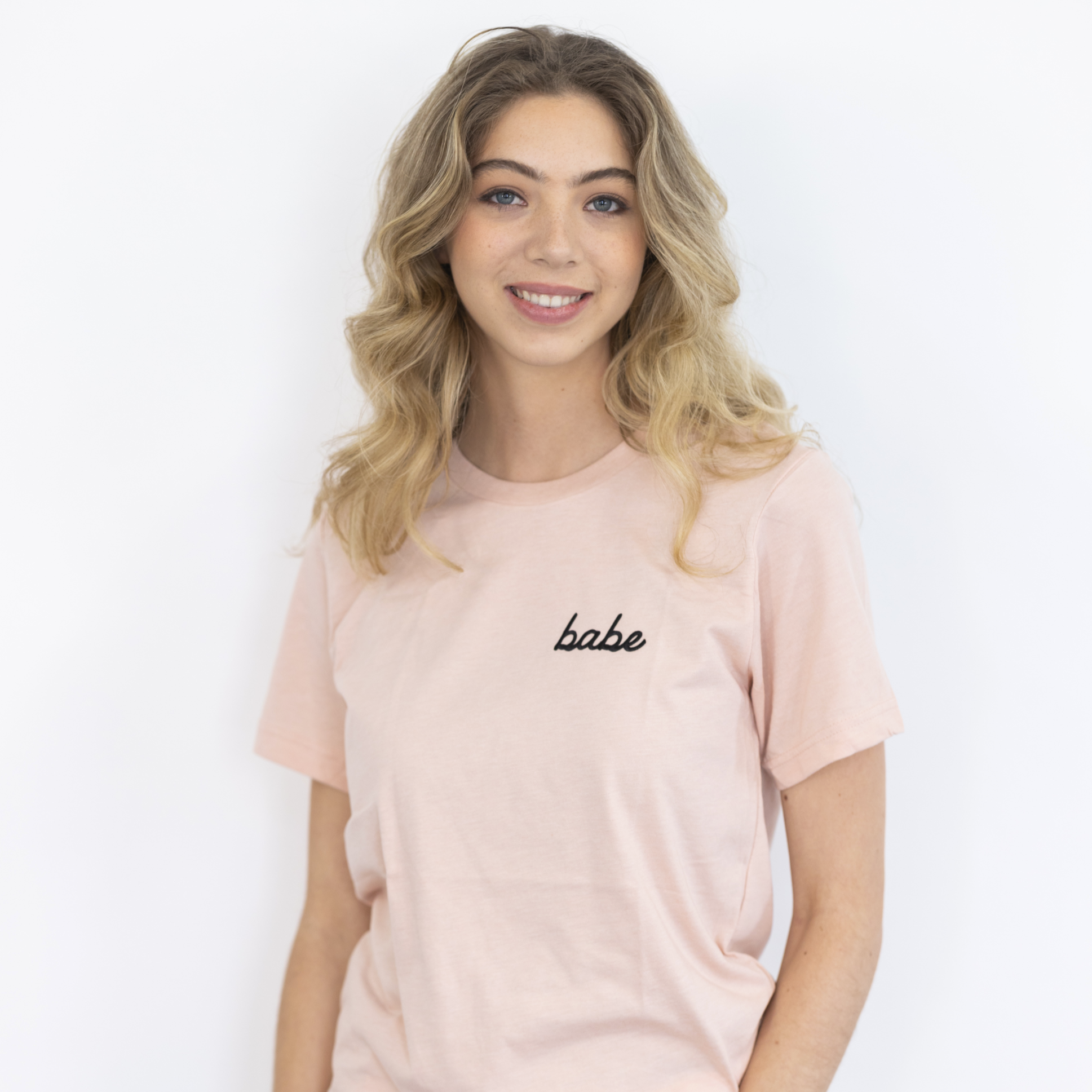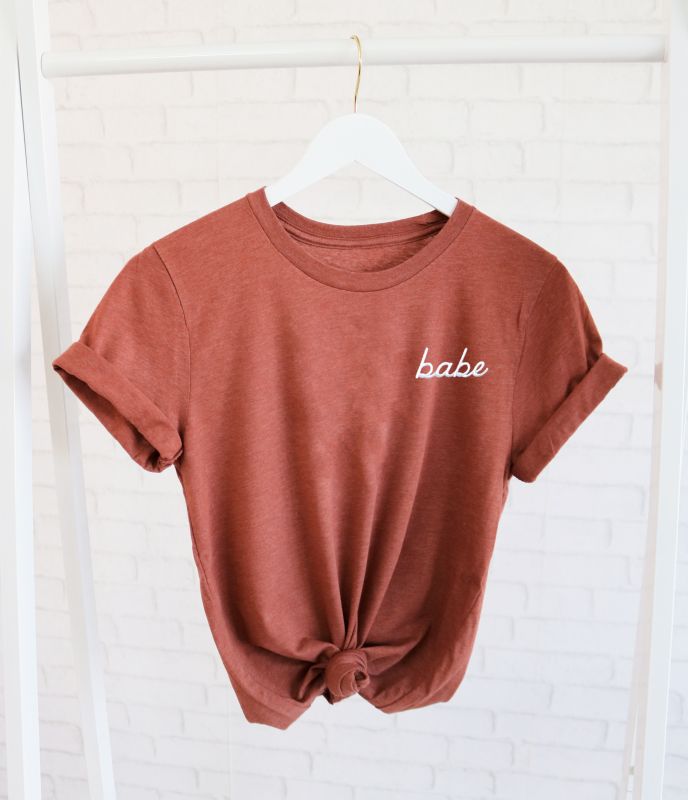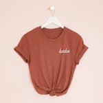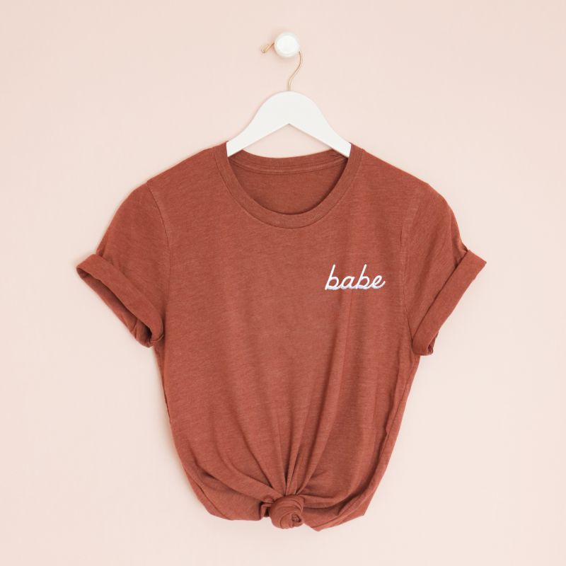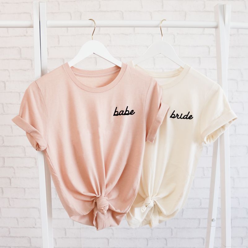 T-shirts with an embroidered wedding patch make a cute outfit for your bridesmaids at your bachelorette party. Each soft cotton jersey shirt has a crew neck with short sleeves and comes with a black embroidered patch. Choose from bride or babe.