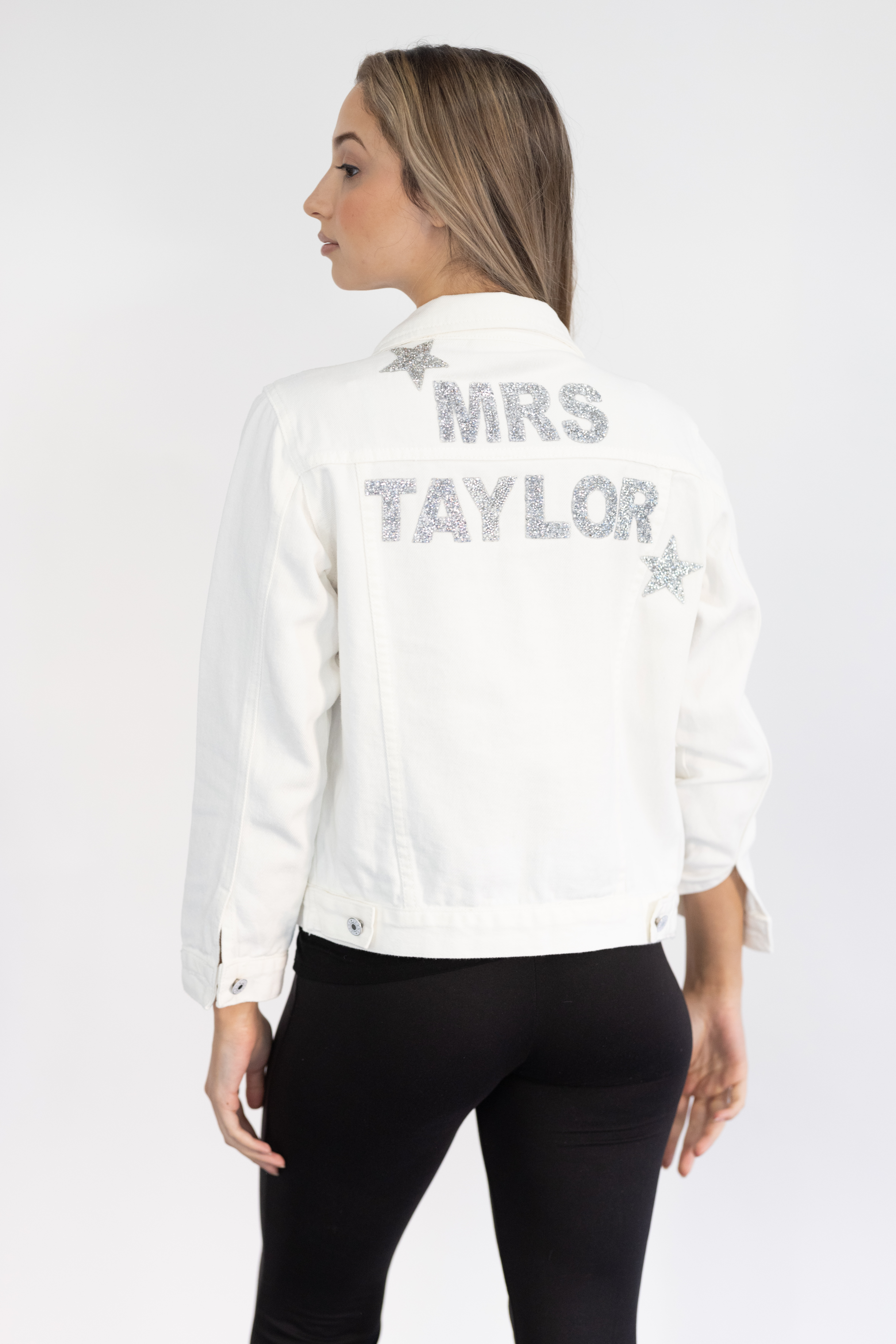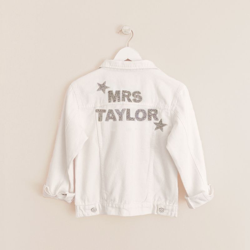 Personalized Bride Denim Jacket are the perfect gift for the bride to be and bridesmaids. Each jean jacket comes with your chosen personalization in sequined patches. Choose from “MRS”, “BABE”, or custom text.