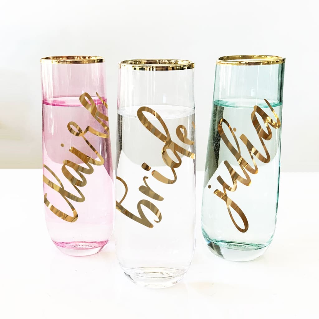 Stemless Glasses are unique gifts for bridesmaids or the newly engaged couple! Monogram each glass with their soon-to-be shared initial to toast the newlyweds or have one made for each bridesmaid as a thank you gift. Each gold rimmed glass comes with a script monogram or name written in METALLIC GOLD vinyl and in your choice of mint, pink, or clear glass.