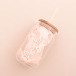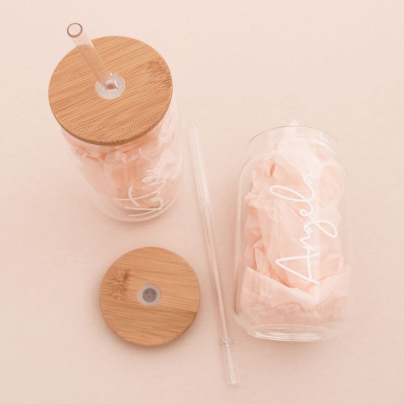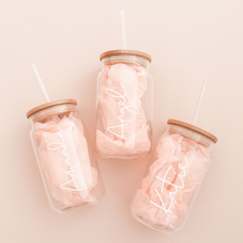 Personalized glass coffee cups make a great gift for bridesmaids, friends and family who love to drink iced coffee. Each glass tumbler has a can shape, bamboo lid, clear plastic straw, and is personalized with the name of your choice in white vinyl.
